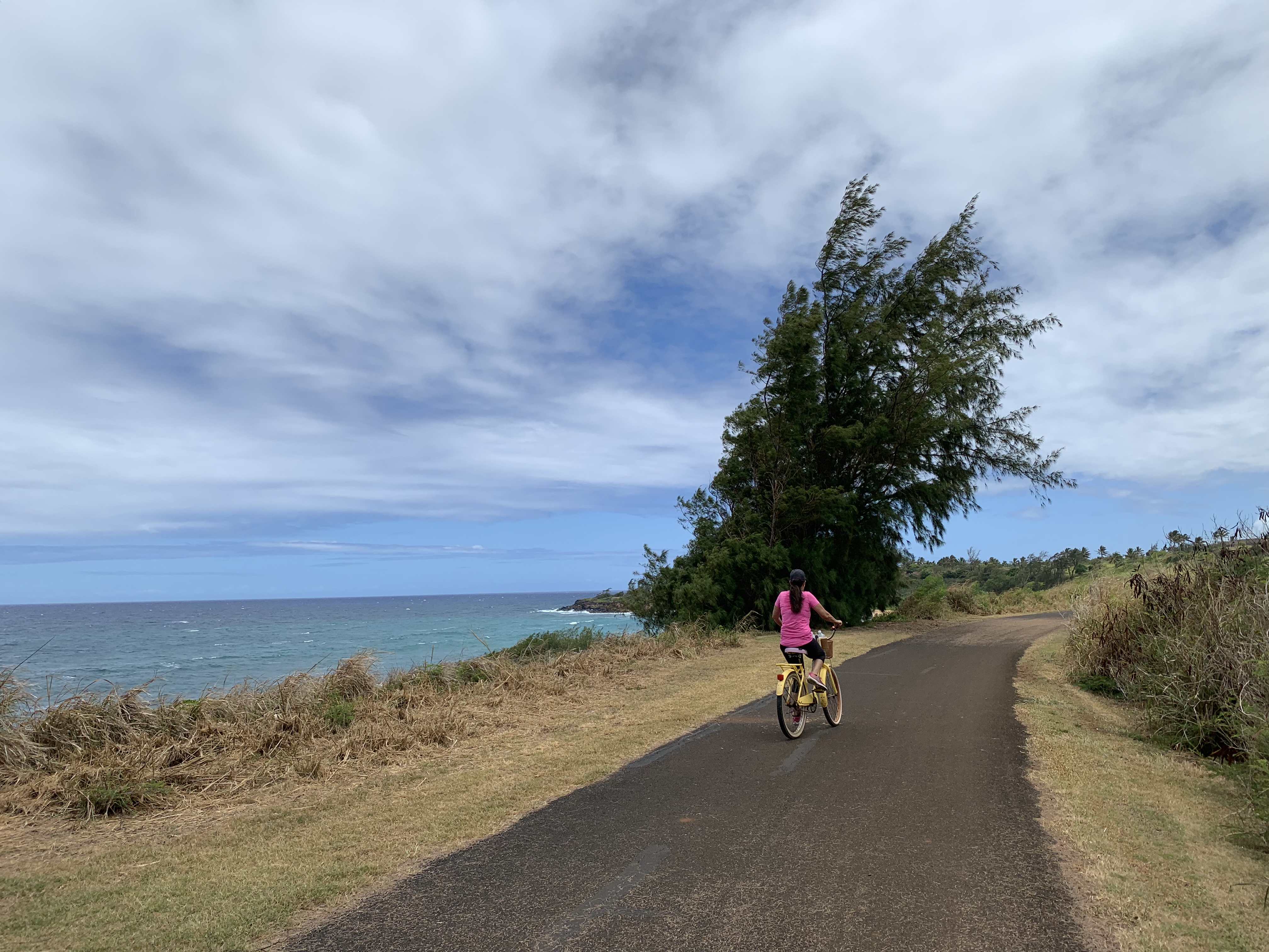 Today I went on a lovely bike ride along the coast. The Kapaa Bike Path is on the east side of Kauai. It has gorgeous views of Kealia and Donkey Beaches and the beautiful Pacific Ocean. It is fairly flat and is an easy ride. There are lots of places that rent bikes in Kapaa so you can easily hop on the path. The place I went today is called Hele On. They rent bikes for $5.00 for an hour. It takes me about 45-50 minutes to bike to the end and back, so an hour is usually all I need. It is one of my very favorite things to do here. I pop on my headphones and listen to a good book or some fun music and get some exercise and beautiful views at the same time.
